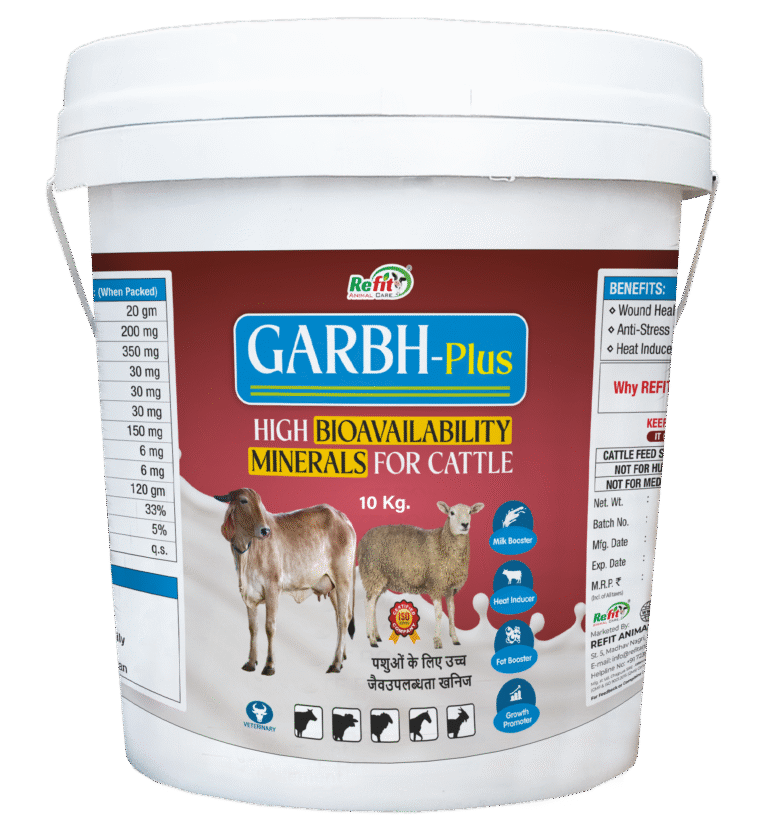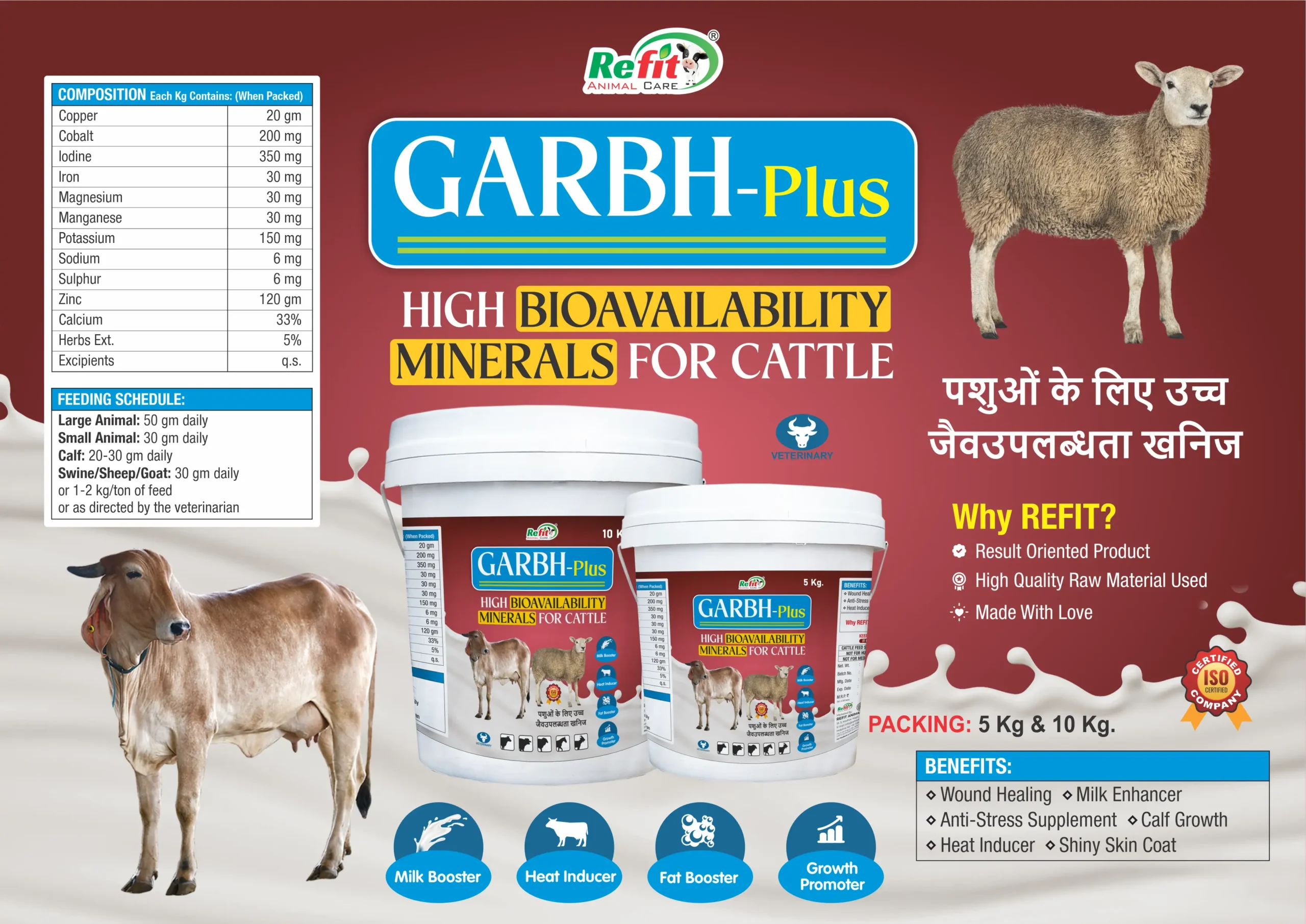 Garbh Plus is a highly effective reproductive health supplement specially formulated for cows, buffaloes, heifers, goats and breeding livestock. Enriched with essential fertility-boosting minerals, vitamins, herbal extracts, and uterine tonics, this supplement helps improve conception rates, supports healthy gestation, regulates estrus cycles, and reduces repeat breeding issues.