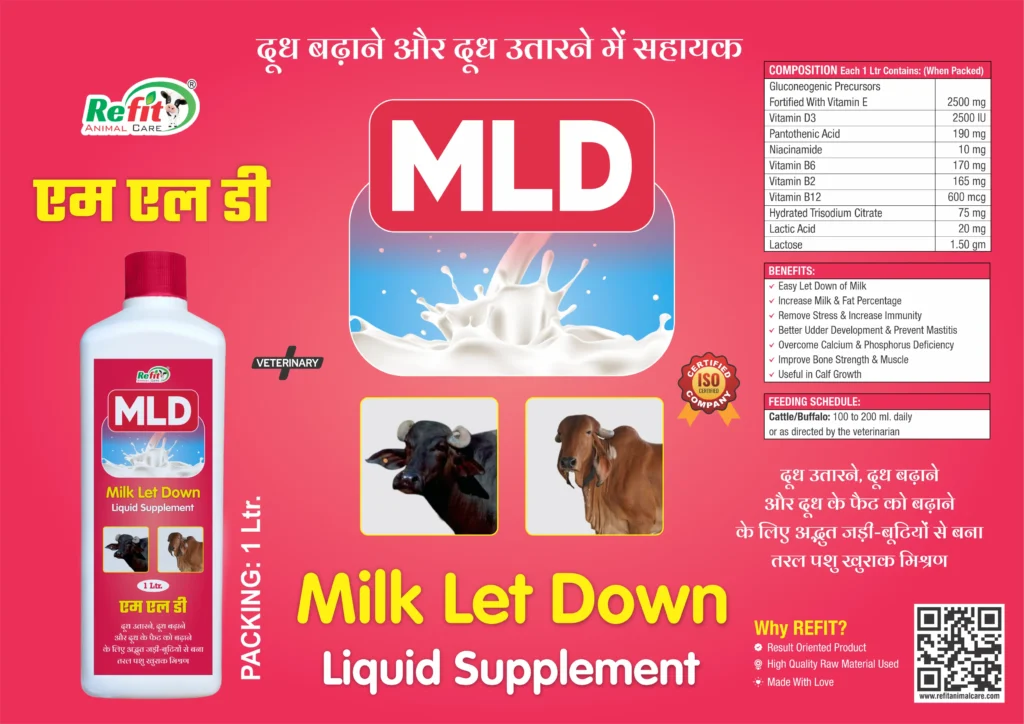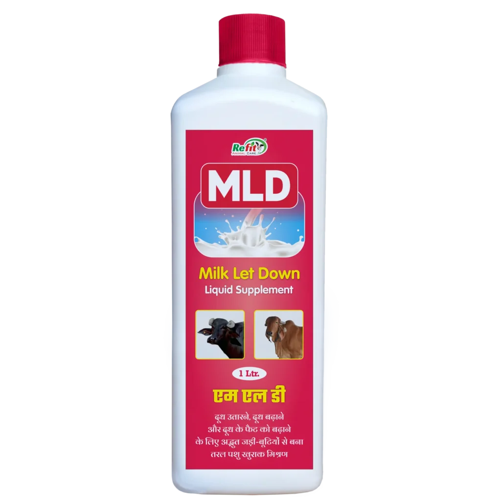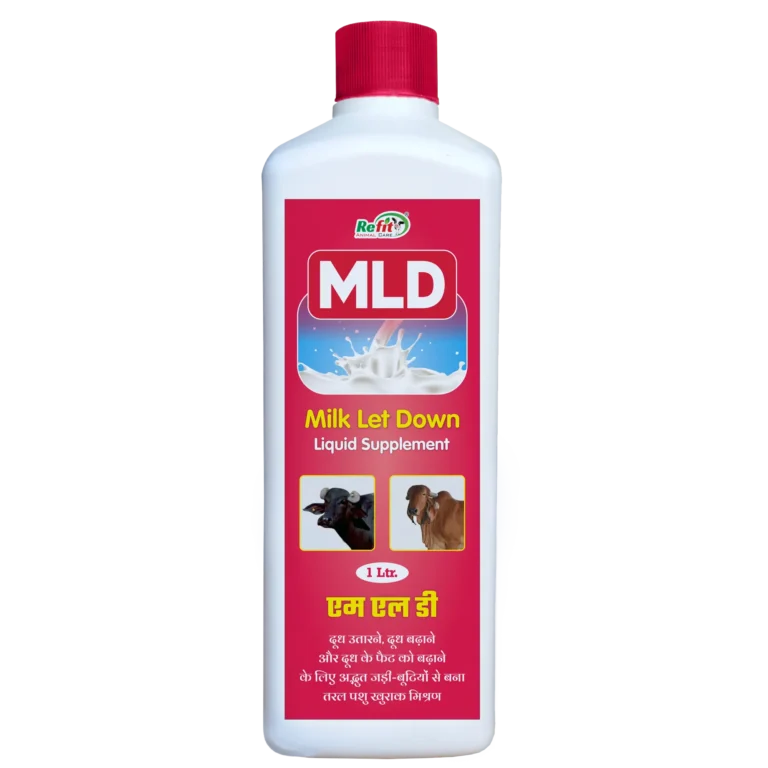 MLD (Milk Let Down Liquid Supplement) is a scientifically developed lactation enhancer formulated to support smooth milk let down and improve milk productivity in dairy animals. Enriched with essential vitamins, gluconeogenic precursors, lactic acid, and metabolic boosters, MLD works by strengthening the animal’s hormonal response, improving udder health, and reducing stress during milking. This liquid supplement helps increase milk yield, enhances fat percentage, boosts immunity, and corrects calcium–phosphorus imbalance—making it ideal for cattle, buffaloes, goats, sheep, horses, and swine.