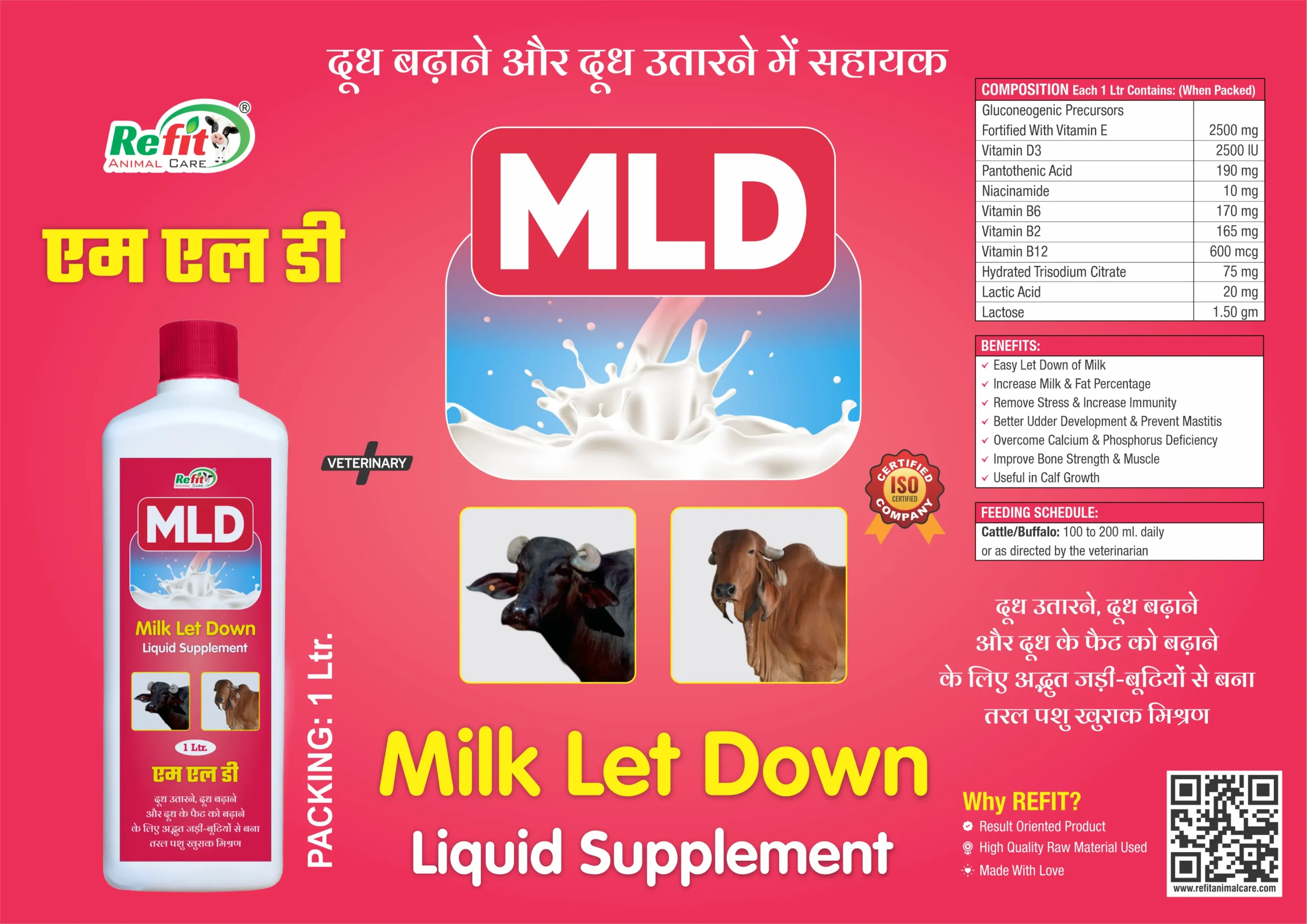 MLD is a specially formulated liquid supplement designed to support smooth, natural, and efficient milk let down in cattle and buffaloes. Enriched with essential vitamins, gluconeogenic precursors, lactic acid, and metabolic boosters, MLD helps improve milk yield, enhance milk fat percentage, and promote better udder health. This powerful formulation works by supporting hormone balance, reducing stress, and improving metabolic activity during lactation, ensuring the animal performs at its best.